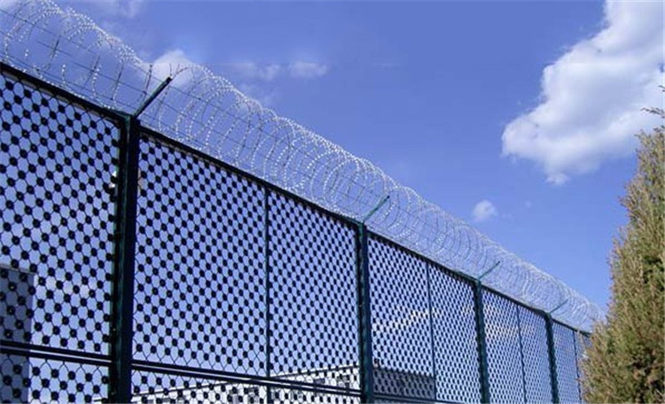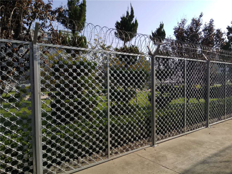 2:監獄鋼網墻用在放風場 警戒線內就需要做成2.5-5m左右的高度。上部加Y型柱,有效防止犯人的逃脫,因為上部會安裝刀片刺繩,對人也起到恐嚇的作用。其他特殊規格均可定做。我們會為您提供**好的使用方案。