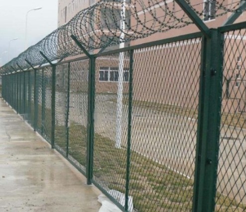 監(jiān)獄巡邏道隔離網(wǎng)整體設計高大、美觀、實用,網(wǎng)墻的設計具剪切、防攀爬功能,能夠十分有效的防止罪犯的潛逃。監(jiān)獄巡邏道鋼網(wǎng)墻V型架頂端安裝刀片刺網(wǎng),直徑采用50cm-60cm刀片刺網(wǎng)主要是由熱鍍鋅鋼板或不銹鋼薄板沖壓而成的,它擁有尖銳的刀片,高張力鍍鋅鋼絲或者不銹鋼絲做芯線組合而成的產(chǎn)品。